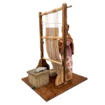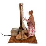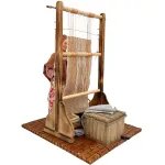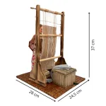 Statua artigianale in resina da 30 cm, in movimento, raffigurante una donna in stile popolare intenta a tessere al telaio. Il modello è stato creato dall'artista locale Michela Nibaldi in esclusiva per LCR Presepi di Messi Leandro. Il movimento è stato realizzato personalmente da Messi Leandro. La figura indossa abiti in vero tessuto, curati nei dettagli e ispirati alla tradizione contadina. Il movimento del busto, che si muove lateralmente, riproduce in modo realistico il gesto della tessitura, rendendo la scena dinamica e credibile. Il telaio in legno e gli accessori completano il quadro, ideale per arricchire presepi di grandi dimensioni.