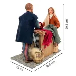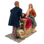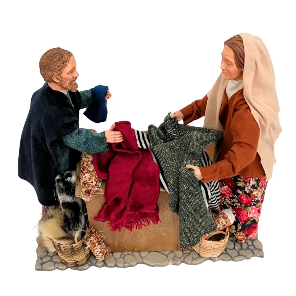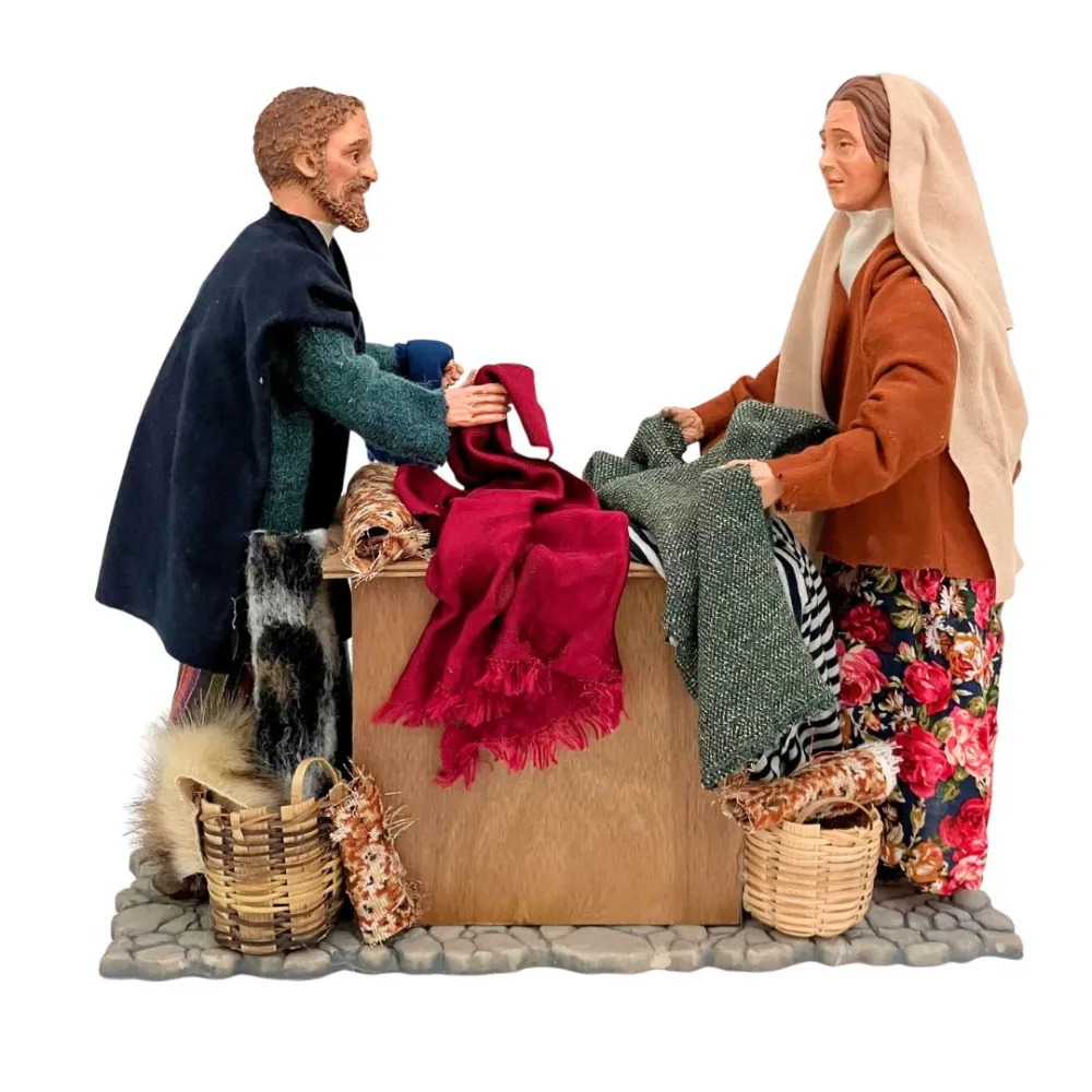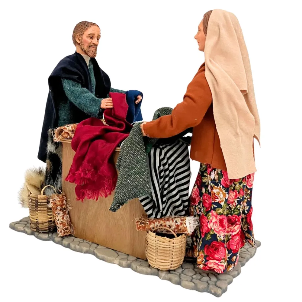 Scena artigianale con statue in resina da 30 cm in stile popolare, in movimento, raffigurante una bancarella di stoffe. Il modello è stato creato dall'artista locale Michela Nibaldi in esclusiva per LCR Presepi di Messi Leandro. Il movimento è stato realizzato personalmente da Messi Leandro. L’uomo, con un mantello scuro e abiti in tessuto grezzo, solleva una stoffa colorata per mostrarla alla cliente, che indossa una veste con fantasia floreale e muove il capo in cenno di consenso. Il banco è colmo di tessuti variopinti, dalle tinte vivaci ai motivi più sobri, arricchito da ceste di vimini e rotoli di stoffa. Una scena che rappresenta con fedeltà la vita quotidiana del mercato popolare.