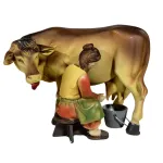 Mungitrice da 10 cm in resina. Questa statua rappresenta una scena di vita rurale, con una giovane donna che sta mungendo una mucca. La ragazza, vestita con una tunica colorata e un grembiule verde, è seduta su uno sgabello mentre tiene una mano sulla mammella della mucca e l’altra sul secchio per raccogliere il latte. La mucca, con un mantello marrone sfumato e il volto sereno, è posizionata accanto alla donna, creando un’immagine di intimità e lavoro quotidiano. La scena cattura un momento semplice e laborioso della vita contadina, molto comune nei presepi che cercano di rappresentare la quotidianità del mondo rurale in un periodo storico antico. I dettagli della mucca e della donna, così come la posizione naturale e rilassata dei personaggi, contribuiscono a rendere la scena verosimile e affettuosa.