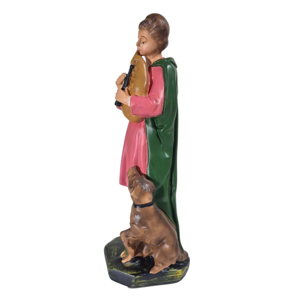 Pifferaio con cane in gesso serie 30 cm. E' un'opera di alta qualità, realizzata e curata nei minimi dettagli dall'eccellenza dell'arte toscana. La realizzazione avviene con metodi artigianali, partendo dalla colata del gesso fino alla decorazione a pennello, seguendo tecniche tradizionali tramandate da tre generazioni. Il pifferaio è una figura classica del presepe, spesso rappresentata con un mantello e un piccolo flauto (piffero) tra le mani. In questa statuina, indossa una tunica rosa e un mantello verde, e sta suonando con dedizione il suo strumento. Accanto a lui c'è un cane che sembra ascoltare incantato, un dettaglio tenero che sottolinea la serenità e la bellezza del momento. Il pifferaio, come altri suonatori del presepe, è simbolo di gioia semplice e della tradizione pastorale legata al Natale.