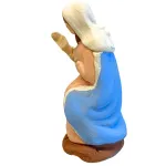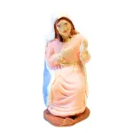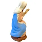 Statuina in terracotta da 7 cm, raffigurante la Madonna, realizzata e dipinta a mano. Maria è rappresentata in posizione seduta, con le mani raccolte sul petto in un gesto di dolce adorazione. Indossa una veste rosa tenue con dettagli dorati e un mantello bianco bordato d’azzurro che le avvolge le spalle e il capo, in un’iconografia semplice ma tradizionale. I tratti stilizzati e la finitura opaca rendono la figura perfetta per presepi artigianali o rustici, con un tocco autentico e spirituale. Un elemento centrale e simbolico per completare la scena della Natività con sobrietà e devozione.