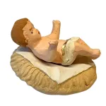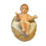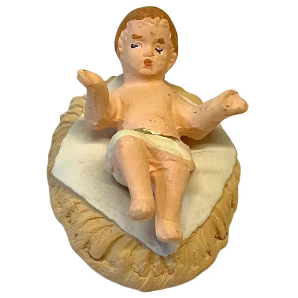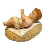 Statua artigianale in terracotta per statue da 7 cm, raffigurante il Bambino Gesù adagiato su una culla di paglia stilizzata, ricoperta da una coperta bianca. Il Bambino è modellato con le braccia sollevate e le gambe leggermente piegate, in una posa accogliente e serena, simbolo centrale della Natività. Dipinto a mano con tonalità delicate, presenta un’espressione dolce e stilizzata, perfettamente in linea con le scene presepiali tradizionali. Ideale per essere collocato nella capanna accanto a Maria, Giuseppe, il bue e l’asinello, è un elemento immancabile per ogni presepe classico.