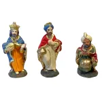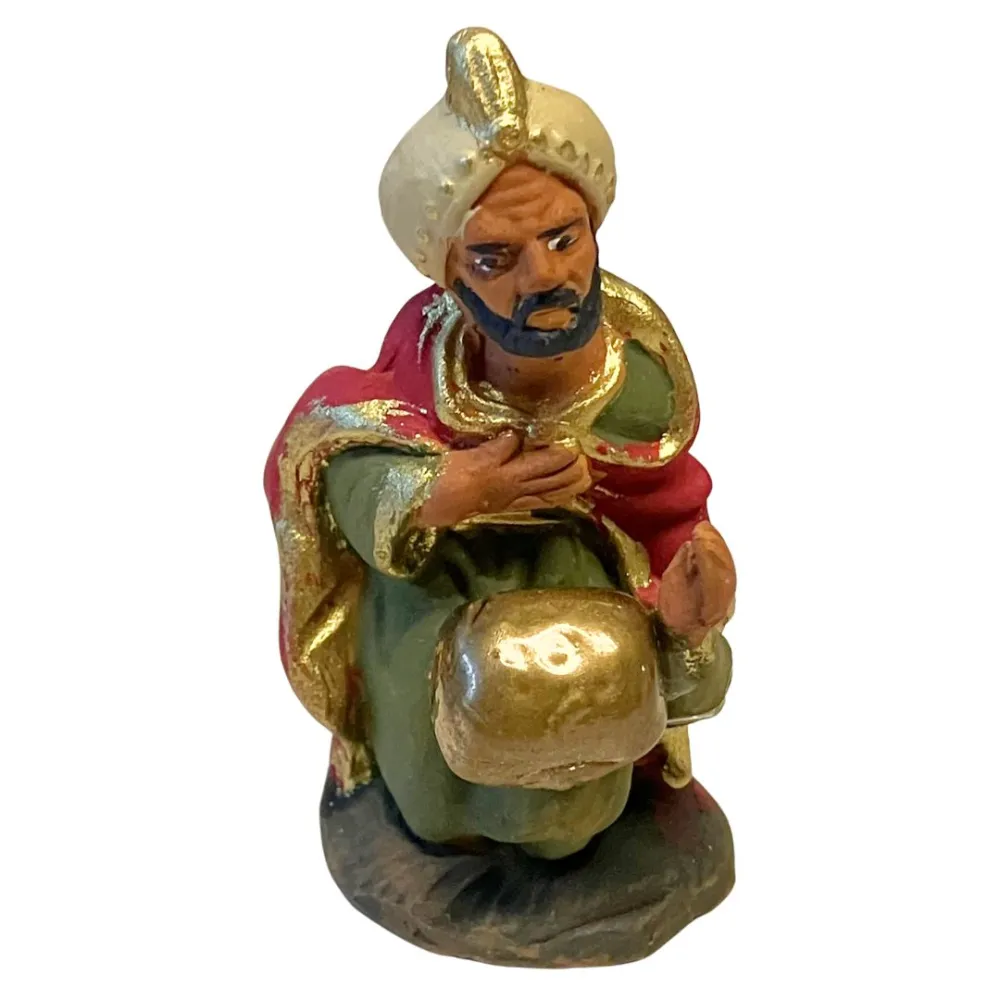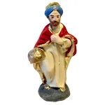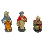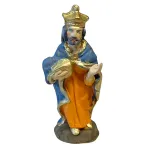 Set Re Magi da 7 cm, realizzati in terracotta e dipinti a mano. Le tre figure (Melchiorre, Gaspare e Baldassarre), sono raffigurate nell’atto dell’offerta, ciascuno con un dono simbolico: oro, incenso e mirra. Le statue presentano vesti sontuose in colori vivaci con dettagli dorati: Melchiorre indossa una tunica arancione con mantello blu e corona regale, Gaspare veste di bianco e rosso con turbante azzurro, mentre Baldassarre, inginocchiato, è caratterizzato da un turbante chiaro e abiti verdi con mantello rosso. Ideali per completare la scena dell’Epifania, aggiungono maestosità e significato simbolico al presepe tradizionale.