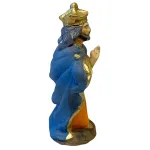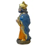 Statua in terracotta, da 7 cm, raffigurante uno dei tre Re Magi, dipinta a mano con colori vivaci e dettagli dorati. Il personaggio è ritratto in posizione eretta, con lo sguardo rivolto in avanti e le mani protese in gesto d’offerta: nella mano destra regge un contenitore dorato, simbolo del dono dell’oro. Indossa una lunga tunica arancione coperta da un ampio mantello blu rifinito in oro, che conferisce maestosità e solennità alla figura. Il capo è adornato da una corona regale dorata. Ideale per completare la scena dell’Epifania, questa figura aggiunge eleganza e significato simbolico alla Natività.