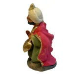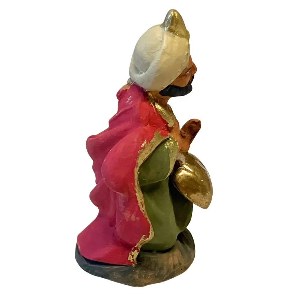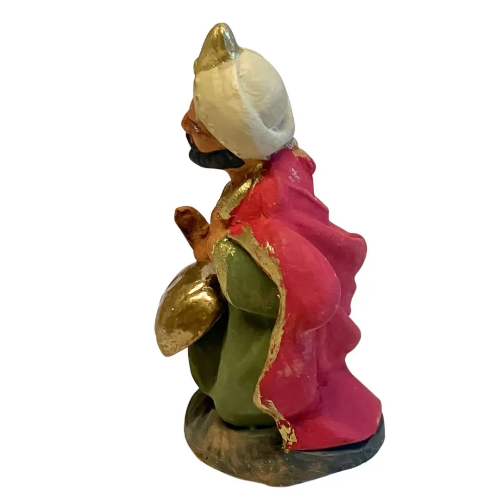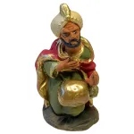 Statua in terracotta, da 7 cm, realizzata a mano, raffigurante uno dei tre Re Magi nell’atto di offrire un dono. La figura è rappresentata inginocchiata, con il busto eretto e lo sguardo rivolto verso il Bambino Gesù, mentre porge tra le mani un contenitore dorato, simbolo della mirra. L’abbigliamento è ricco di dettagli: veste lunga verde scuro, mantello rosso con bordi dorati e turbante decorato color avorio, in stile mediorientale. I colori vivaci e le finiture in oro accentuano la regalità della figura, rendendola ideale per arricchire la scena dell’Adorazione nel presepe tradizionale.