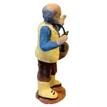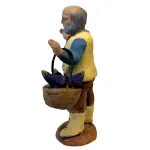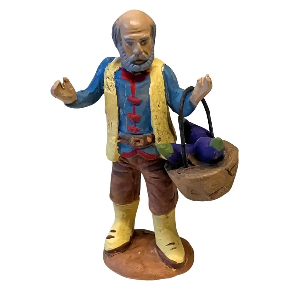 Statuina artigianale in terracotta, da 7 cm, raffigurante un contadino anziano, ideale per completare scene rurali o mercatini all’interno del presepe. Il personaggio è modellato con cura nei dettagli e dipinto a mano, e tiene in mano una cesta colma di melanzane, simbolo del raccolto contadino. Indossa un gilet giallo su camicia azzurra con dettagli rossi, pantaloni marroni e stivali chiari. I tratti del volto, marcati da barba e stempiatura, restituiscono l’immagine di un uomo di campagna esperto e laborioso. La posizione eretta e il cestino pendente dal braccio conferiscono naturalezza e movimento alla scena, rendendolo perfetto per ambientazioni agricole, orti o bancarelle di prodotti locali.