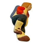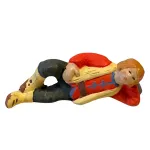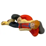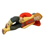 Statua artigianale in terracotta, da 7 cm, raffigurante un giovane personaggio sdraiato lateralmente, ideale per arricchire scene rilassate o conviviali all’interno del presepe. La figura è adagiata sul fianco destro, con il gomito a terra e la testa poggiata sulla mano, in un atteggiamento disteso e contemplativo. Indossa un corpetto rosso con dettagli blu, cintura marrone, pantaloni scuri e un gilet chiaro. Gli stivali gialli decorati completano l’abbigliamento tipico contadino. Perfetta da posizionare nei pressi di fuochi, stalle, mercati o momenti di riposo sotto una tettoia, aggiunge varietà e realismo alle ambientazioni presepiali.