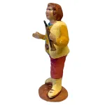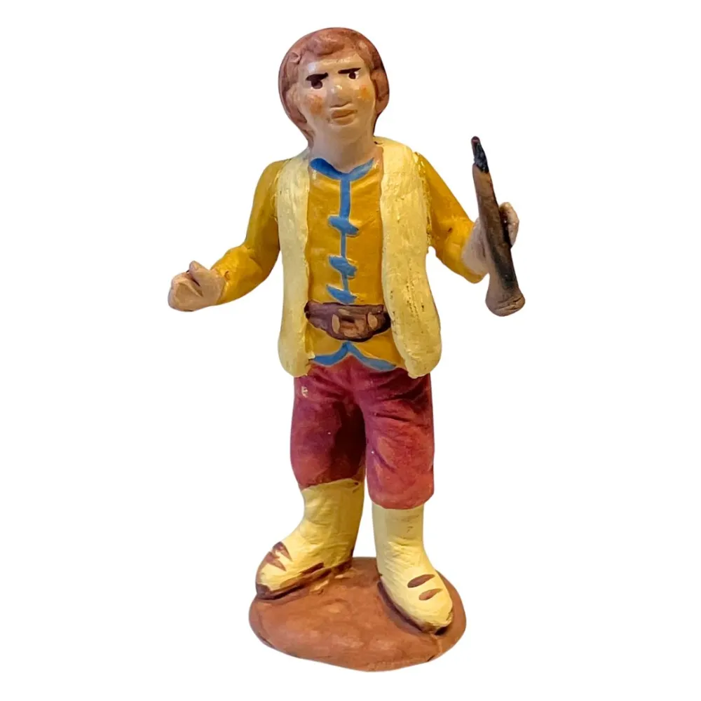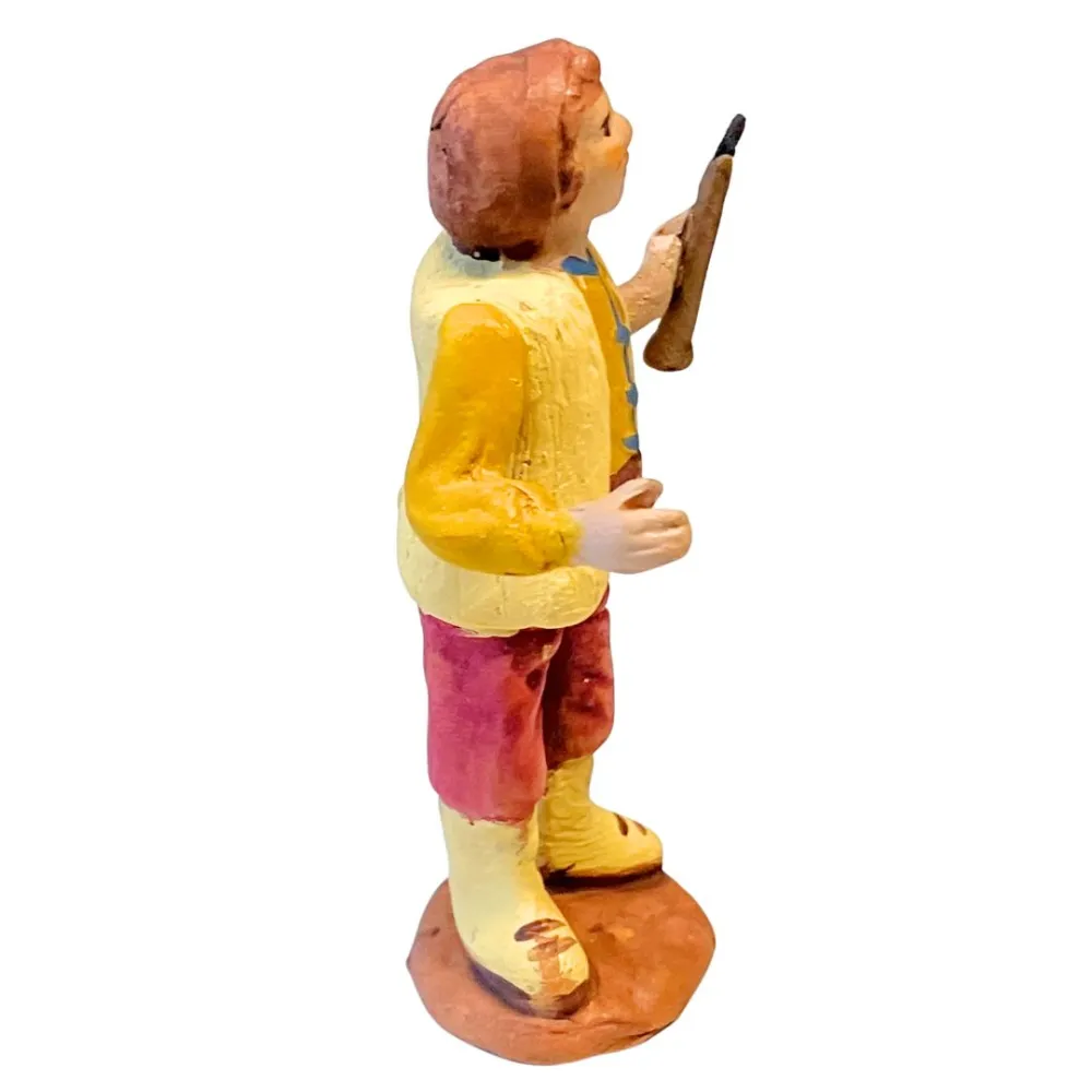 Statua in terracotta dipinta a mano, da 7 cm, raffigurante un giovane suonatore di piffero, tipico dei presepi della tradizione italiana. L’abito è vivace: camicia gialla, gilè chiaro, pantaloni rossi e stivali gialli. In una mano stringe lo strumento a fiato, pronto a intonare melodie natalizie. Perfetta per arricchire scene musicali o folkloristiche del presepe, questa figura rappresenta uno dei personaggi più iconici delle ambientazioni natalizie ispirate alla cultura popolare.