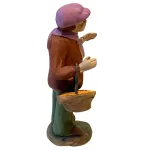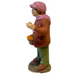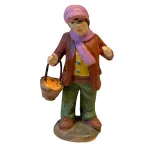 Statua in terracotta dipinta a mano, alta circa 7 cm, raffigurante un giovane venditore con cestino di carote. Indossa giacca marrone, pantaloni verdi e una vistosa sciarpa rosa, perfetta per ambientazioni invernali. Il cestino, ricco di carote, dona un tocco rustico e realistico alla scena. Ideale per completare bancarelle, mercatini o scene contadine nel presepe tradizionale.