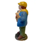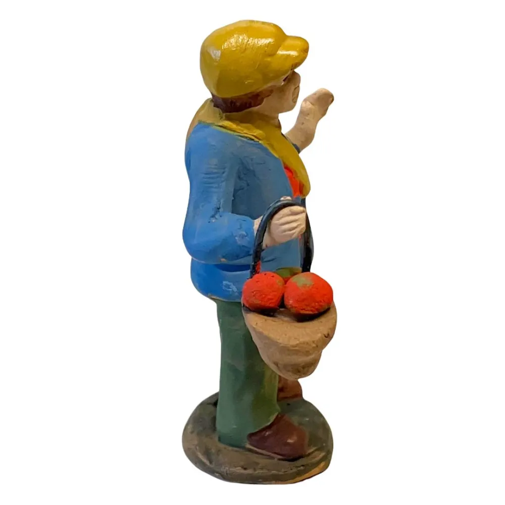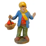 Statua artigianale in terracotta dipinta a mano, alta circa 7 cm, raffigurante un giovane venditore con un cestino colmo di pomodori rossi. Indossa abiti variopinti invernali: giacca azzurra, sciarpa e berretto gialli, e pantaloni verdi, perfetti per ambientazioni di mercatini o scene rurali. Il cestino, ben rifinito, aggiunge realismo e colore alla composizione presepiale. Ideale per arricchire il tuo presepe con dettagli di vita quotidiana e scenette contadine ispirate alla tradizione mediterranea.