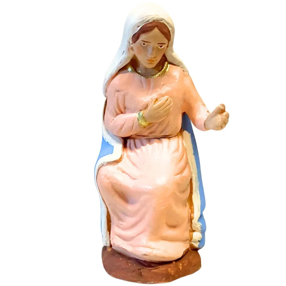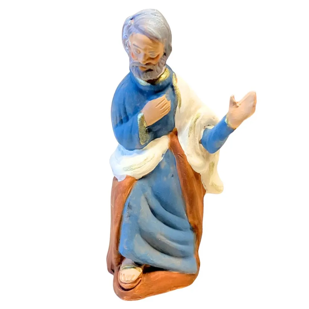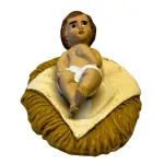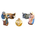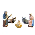 Set, da 10 cm, che rappresenta la scena centrale del presepe, con cinque personaggi iconici realizzati interamente in terracotta e dipinti a mano con colori vivaci e finiture curate. Al centro troviamo il Bambinello adagiato in una mangiatoia di paglia, circondato da Maria in atteggiamento di preghiera e Giuseppe in piedi con gesto benedicente. Ai lati, il bue e l’asinello sono accovacciati, completando il quadro di serenità e raccoglimento. Le statue sono adatte sia per allestimenti tradizionali che per ambientazioni rustiche. L'espressività dei volti e la lavorazione artigianale conferiscono al set un carattere autentico e senza tempo.