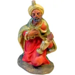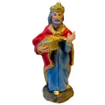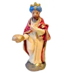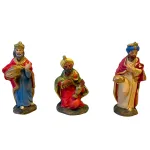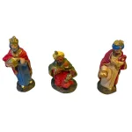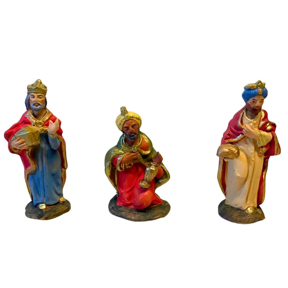 Set di statue in terracotta dipinte a mano raffiguranti i tre Re Magi: Gaspare, Melchiorre e Baldassarre. Ogni figura è riccamente colorata e impreziosita da dettagli dorati, con abiti dalle pieghe realistiche e accessori che richiamano i doni tradizionali della Natività (oro, incenso e mirra). Due di essi sono rappresentati in piedi e uno in ginocchio. Ideali per completare una Natività da 10 cm in stile classico e per dare risalto al momento dell’Adorazione.