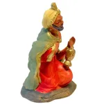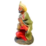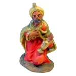 Statua in terracotta dipinta a mano, da 10 cm, raffigurante uno dei Re Magi nell’atto dell’offerta, inginocchiato con un prezioso contenitore d’incenso tra le mani. Indossa una tunica rossa con mantello verde e dettagli dorati, e un turbante decorato. L’espressione devota e la posizione raccolta lo rendono un personaggio ricco di spiritualità, ideale per completare il tuo presepe con un tocco di solennità orientale.