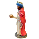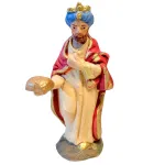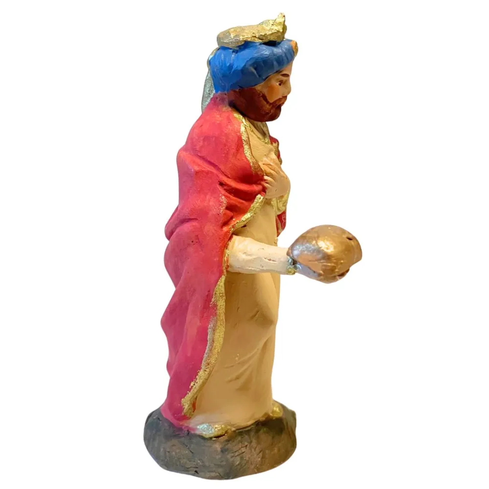 Statua in terracotta dipinta a mano raffigurante il terzo Re Magio, con corona dorata e turbante blu, mentre porge con solennità la mirra in una preziosa ampolla dorata. Indossa una lunga veste chiara con mantello rosso bordato d’oro, che conferisce regalità e calore alla scena. Un elemento indispensabile per completare il gruppo dei Magi nel tuo presepe da 10 cm, evocando l’atmosfera del viaggio e dell’omaggio dei sapienti d’Oriente.
