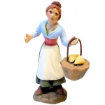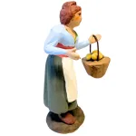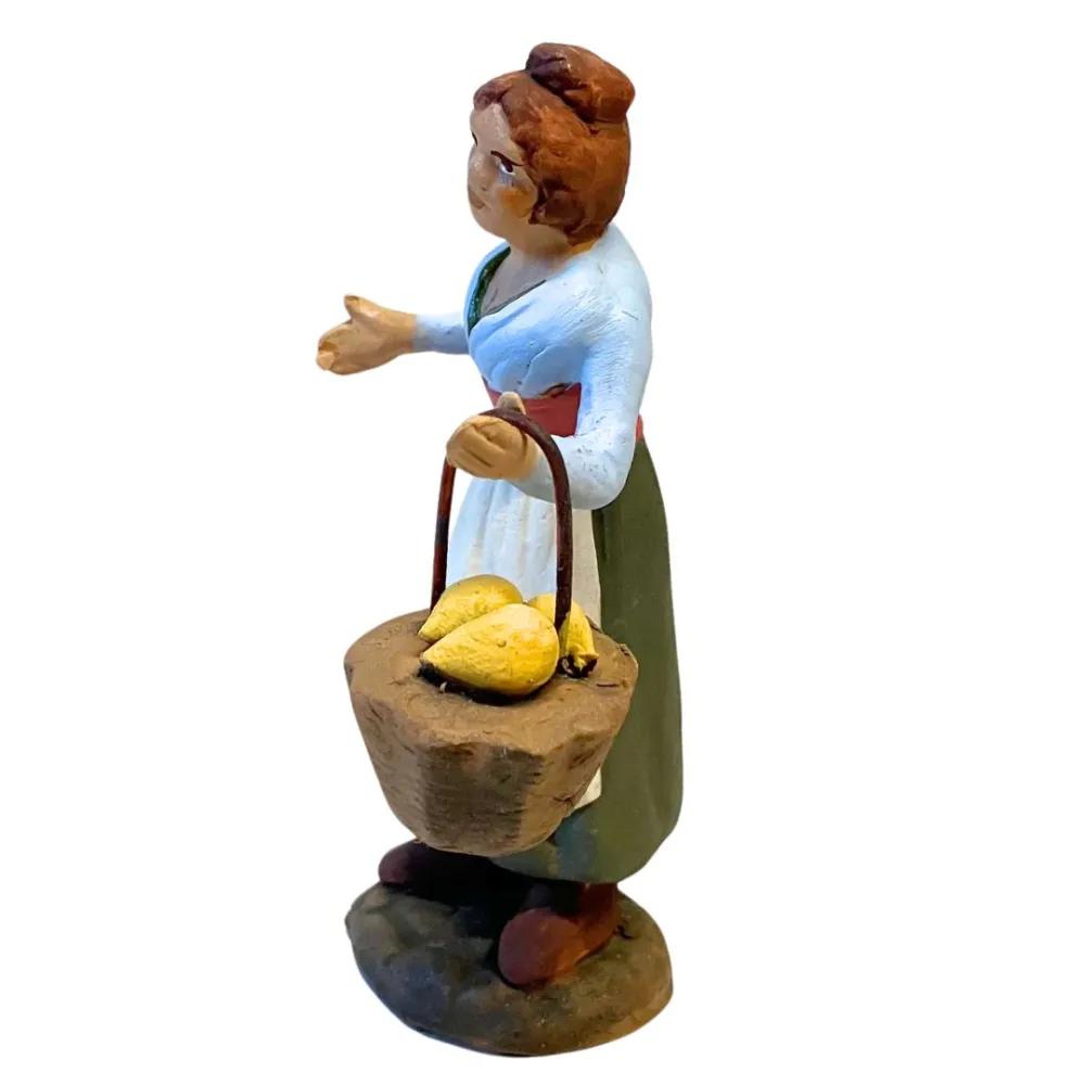Figura in terracotta da 10 cm raffigurante una contadina con grembiule bianco, camicetta azzurra e lunga gonna verde, che porta una cesta colma di limoni. I dettagli sono dipinti a mano, con una resa semplice ma espressiva. Ideale per completare la scena del mercato o delle attività quotidiane nel presepe.