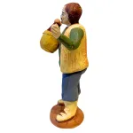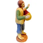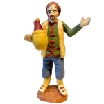 Figura da presepe in terracotta, da 10 cm, raffigurante un contadino in abiti tradizionali: camicia verde, pantaloni blu, gilet ocra e stivali gialli. Nella mano destra tiene un fiasco di vino intrecciato in paglia, simbolo di convivialità e tradizione contadina. Il volto barbuto e l'espressione aperta conferiscono alla statuina un carattere realistico e familiare. Dipinta interamente a mano, è ideale per completare scene rustiche o taverne all'interno del presepe.