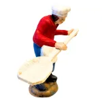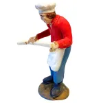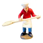 Statua in terracotta, da 10 cm, raffigurante un fornaio con pala da forno. Il personaggio indossa una casacca rossa, pantaloni blu, grembiule bianco e il classico cappello da fornaio. La lunga pala in legno, utilizzata per infornare il pane, è tenuta con entrambe le mani. Ideale per ambientazioni con forni, panetterie o scene di vita quotidiana del presepe. Dipinto a mano con cura nei dettagli.