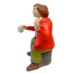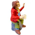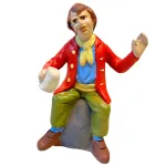Figura in terracotta adatta per essere proporzionata a statue da 10 cm, raffigurante un uomo seduto con un bicchiere nella mano destra. Indossa una giacca rossa, pantaloni verdi, camicia azzurra e foulard giallo. La posa rilassata e l’espressione conviviale rendono questa statuina perfetta per angoli di taverna, osterie o scene di festa all’interno del presepe. Dipinto a mano.