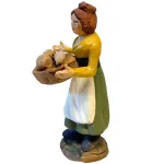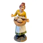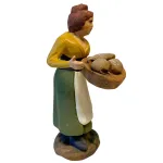 Statua in terracotta, da 10 cm, raffigurante una donna in piedi che porta un cesto colmo di pagnotte e filoni. Indossa un abito giallo senape con grembiule bianco e gonna verde, e ha i capelli raccolti. Il pane ben visibile nel cesto, modellato e dipinto a mano, rende questa figura perfetta per scene di mercato, ambienti rurali o momenti di vita quotidiana nel presepe. Realizzata e dipinta a mano, ideale per aggiungere realismo e calore alla composizione.