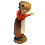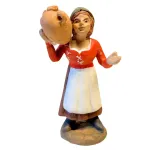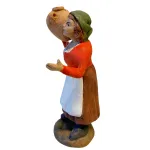 Figura in terracotta dipinta a mano, da 10 cm, che raffigura una giovane donna con abito rustico rosso e grembiule bianco, che porta una brocca in terracotta sulla spalla destra, come se fosse appena tornata dalla fontana o in cammino verso casa. La postura fiera e sorridente, unita ai dettagli del vestiario tradizionale, la rendono ideale per scene di vita quotidiana o ambienti rurali.