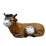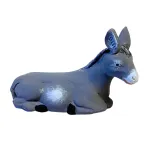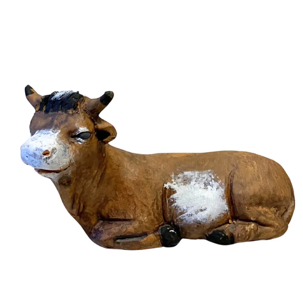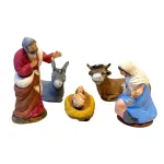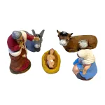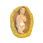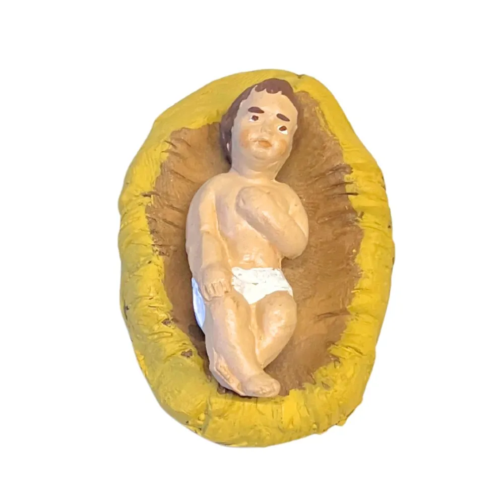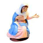 Scena della Natività in terracotta, da 12 cm, composta da cinque personaggi interamente dipinti a mano. Maria è raffigurata in ginocchio, con abito rosa, mantello azzurro e copricapo bianco, mentre guarda con dolcezza il Bambinello adagiato nella mangiatoia dorata, con le braccia aperte. Giuseppe, in piedi, indossa una tunica marrone con mantello rosso e si presenta in atteggiamento protettivo e accogliente. Completano il gruppo il bue e l’asino, entrambi distesi accanto alla mangiatoia, simboli tradizionali di calore e presenza. I colori vivaci, le espressioni curate e le proporzioni realistiche rendono questo set un punto focale perfetto per qualsiasi presepe tradizionale.