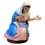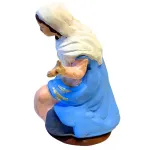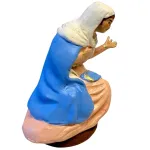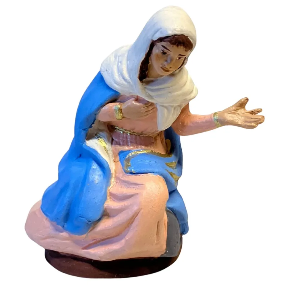 Statua in terracotta raffigurante Maria in ginocchio, proporzionata per statue da 12 cm. La figura presenta un’espressione dolce e raccolta, con la mano destra sul petto e l’altra distesa in un gesto di apertura e accoglienza. Indossa una veste rosa con dettagli dorati, coperta da un ampio mantello azzurro e un velo bianco che incornicia il volto. Dipinta a mano con cura nei dettagli, è ideale per completare la scena della Natività in un presepe classico, aggiungendo un tocco di delicatezza e spiritualità.