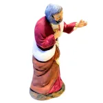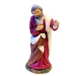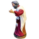 Statua in terracotta dipinta a mano, da 12 cm, raffigurante San Giuseppe in posizione eretta. Il volto sereno e lo sguardo inclinato verso il basso esprimono protezione e contemplazione. Indossa una tunica porpora con dettagli dorati, avvolta da un ampio mantello marrone e un drappo bianco sulle spalle. La mano sinistra è sollevata in un gesto discreto, mentre la destra è posata sul petto, suggerendo devozione e raccoglimento. Una figura essenziale per completare la scena della Natività con eleganza e spiritualità.