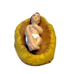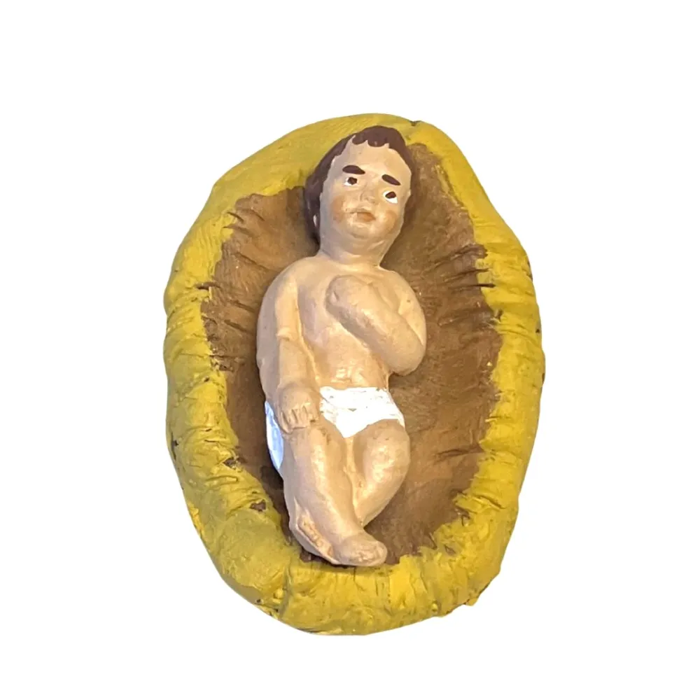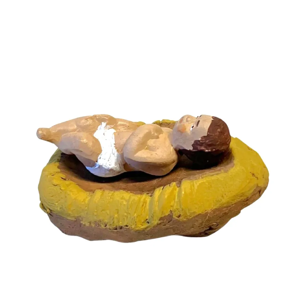 Statua in terracotta dipinta a mano raffigurante il Bambino Gesù adagiato in una mangiatoia, perfetta per essere proporzionata a statue da 12 cm. La figura è ritratta con il corpo leggermente inclinato, il volto sereno e le braccia rilassate, mentre il corpo è avvolto solo da un semplice panno bianco. La mangiatoia, realizzata in rilievo, presenta tonalità ocra e brune che richiamano il calore del fieno, conferendo alla scena un aspetto autentico e tradizionale. Un elemento centrale e simbolico per ogni Natività.