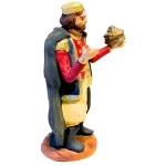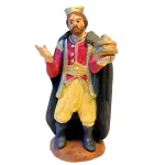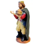 Statua in terracotta dipinta a mano, da 12 cm, raffigurante uno dei Re Magi, in piedi, nell'atto di offrire la mirra. La figura indossa un elegante abito cerimoniale con tunica rossa, pantaloni gialli e mantello scuro, impreziosito da dettagli dorati che richiamano la sua regalità. Nella mano sinistra tiene un contenitore dorato dalla forma elaborata, simbolo della mirra, dono profetico che anticipa la passione di Cristo. La posa composta e lo sguardo solenne rendono questa statua ideale per completare la scena dell’Epifania.