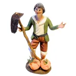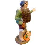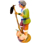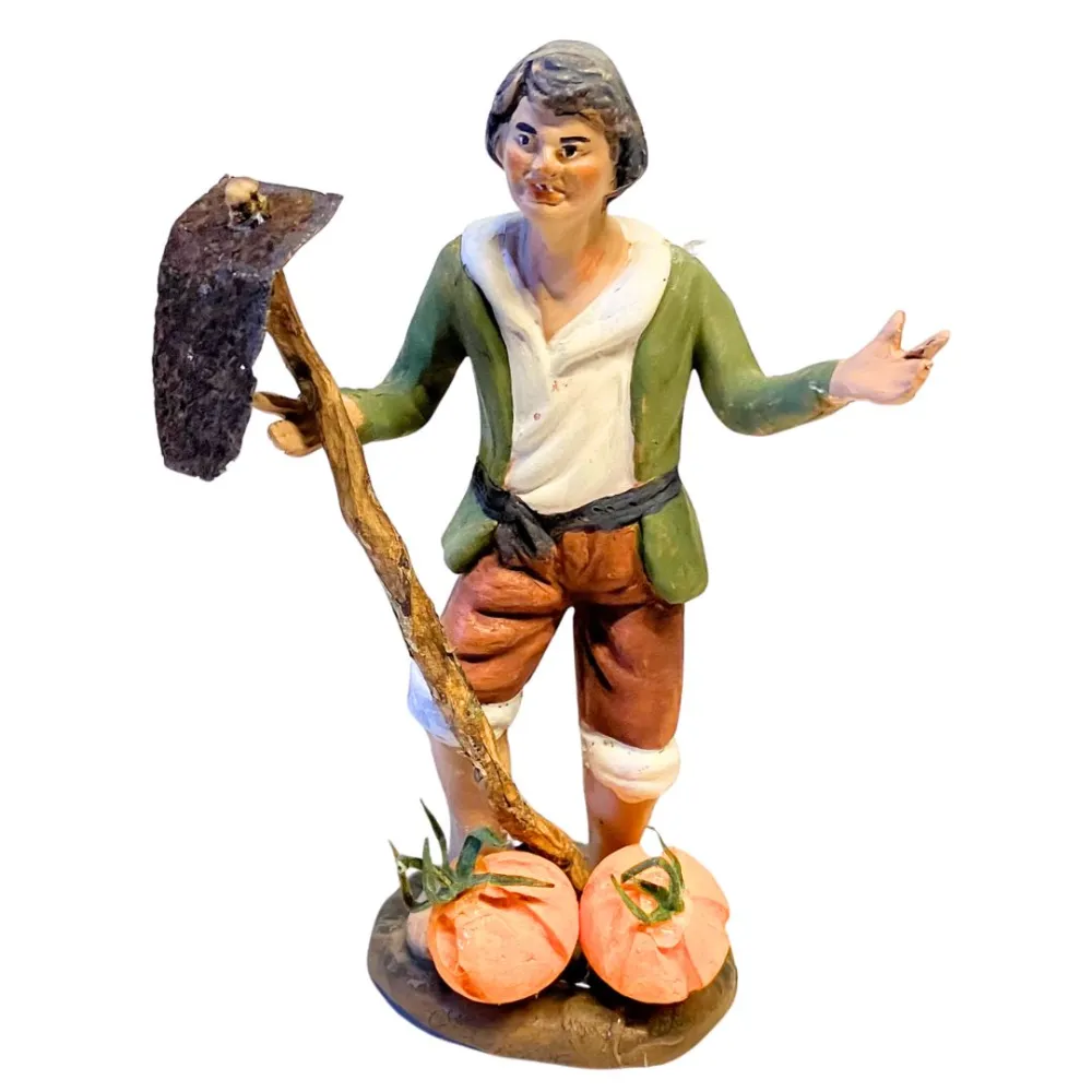 Statua in terracotta dipinta a mano, da 12 cm, raffigurante un contadino con zappa, accanto a due grandi zucche arancioni. Il personaggio è rappresentato in una posa vivace e realistica e un’espressione fiera sul volto. Indossa una camicia aperta sul petto, un gilet verde e pantaloni marroni rimboccati, tipici dell’abbigliamento rurale d’epoca. Questa figura è perfetta per arricchire la scena agricola del presepe con un tocco di autenticità e colore.