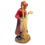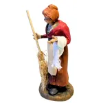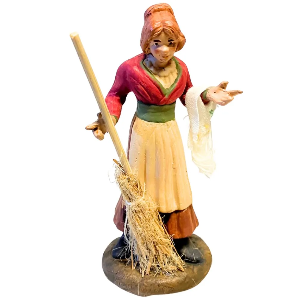 Statua in terracotta da 12 cm dipinta a mano, raffigurante una donna che fa le pulizie con scopa di saggina e panno bianco appoggiato sull’avambraccio. La figura indossa un abito dai colori caldi e rustici: corpino rosso, grembiule chiaro e gonna marrone. Lo sguardo è rivolto in avanti e il corpo è leggermente inclinato in una posa naturale, come se fosse appena stata interrotta durante le faccende. Ideale per aggiungere realismo e quotidianità alla scena del presepe.