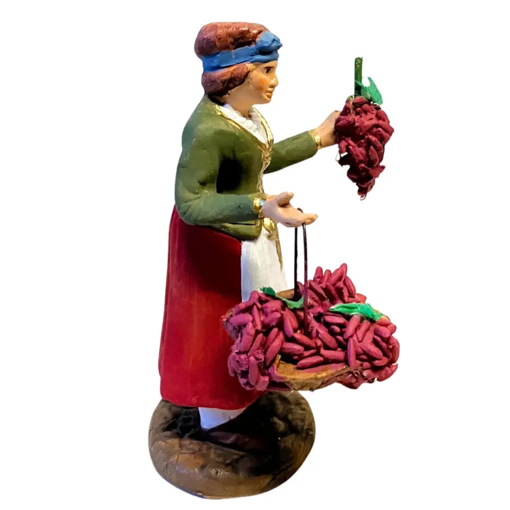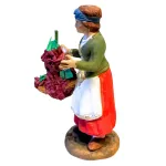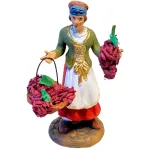 Statua in terracotta da 12 cm raffigurante una donna con abiti tradizionali contadini, nell'atto di trasportare dell’uva appena raccolta. Indossa una gonna rossa con grembiule bianco, una giacca verde oliva con dettagli dorati e una camicia bianca con pizzo al colletto. Un nastro blu le cinge la testa, richiamando i colori tipici della tradizione contadina. Tiene in una mano un cesto colmo di grappoli e nell’altra un singolo grappolo appeso. I dettagli dei chicchi e delle foglie sono accurati, e i colori vivaci esaltano la scena della vendemmia, perfetta per ambientazioni rurali del presepe.
