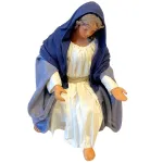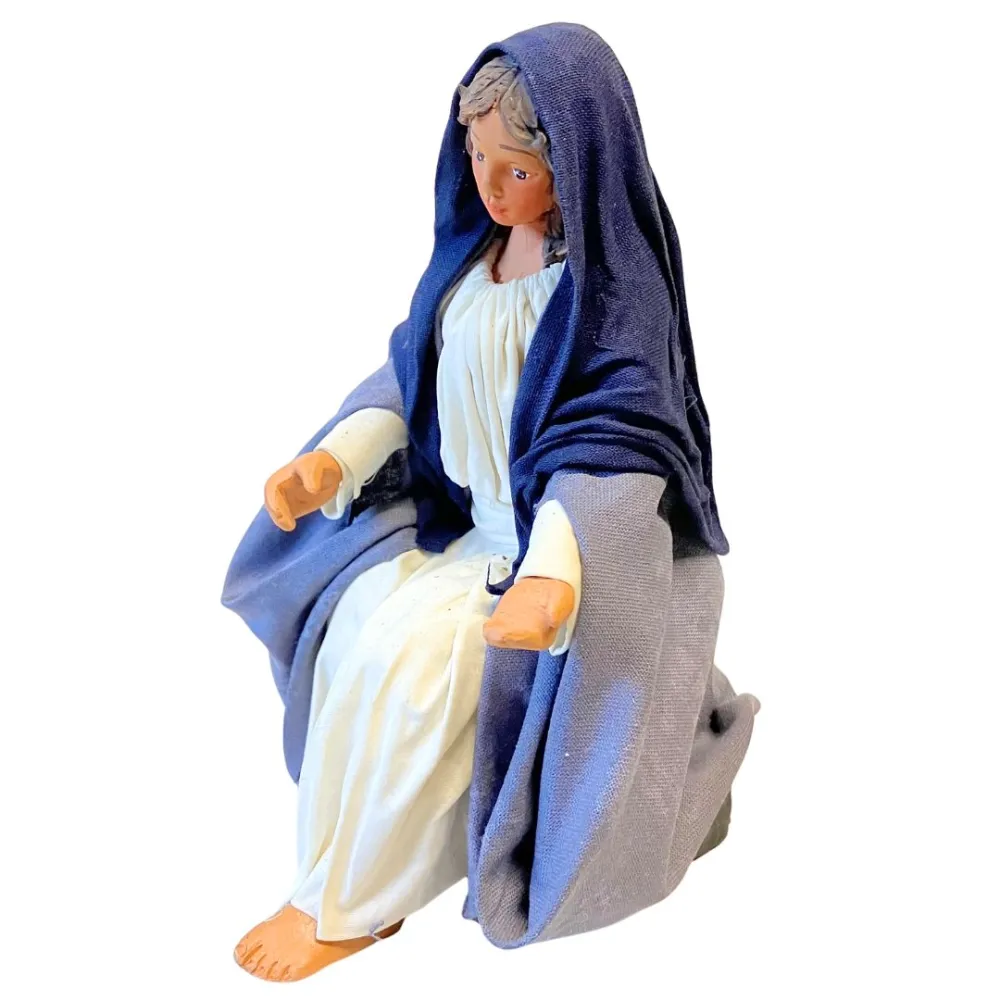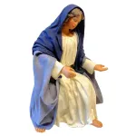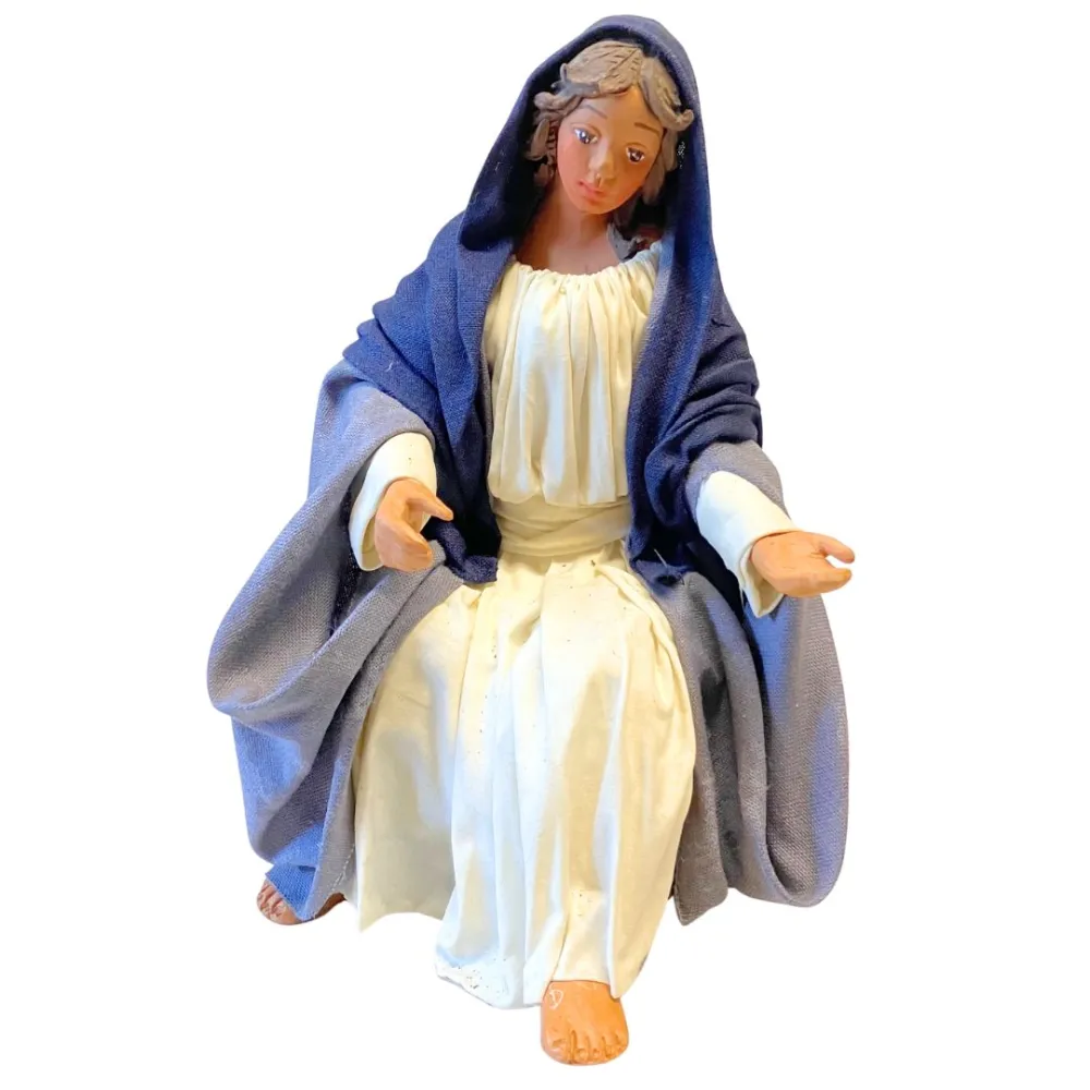 Madonna inginocchiata, realizzata in terracotta e rifinita a mano, per statue da 25 cm. La figura presenta un volto delicato e sereno, con espressione dolce e accogliente. Gli abiti sono in vero tessuto. Le mani sono aperte, rivolte in avanti, nella tipica posizione accogliente della Natività. Statua ideale da abbinare con Bambino Gesù in mangiatoia e San Giuseppe, per completare la scena centrale del presepe tradizionale.