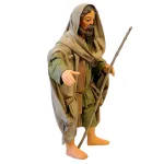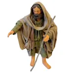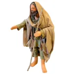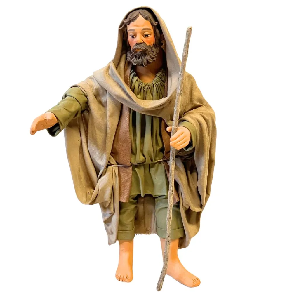 Statua in terracotta da 25 cm raffigurante San Giuseppe, in posizione eretta con bastone nella mano sinistra e braccio destro leggermente disteso in avanti. Il volto è caratterizzato da tratti realistici e un’espressione pacata. Gli abiti, in vero tessuto, sono composti da una tunica verde oliva con cintura in corda e da un ampio mantello marrone chiaro che avvolge spalle e capo. I piedi sono scalzi, in segno di umiltà. Ideale per completare la scena della Natività con Maria in ginocchio e Bambino nella mangiatoia.