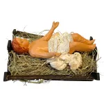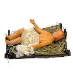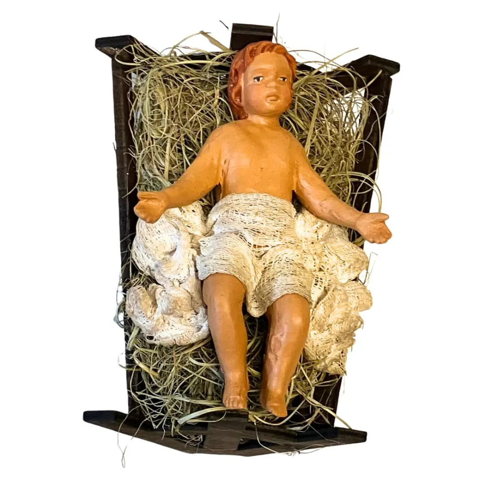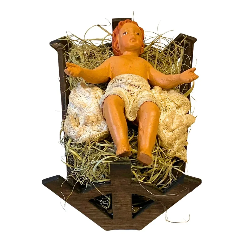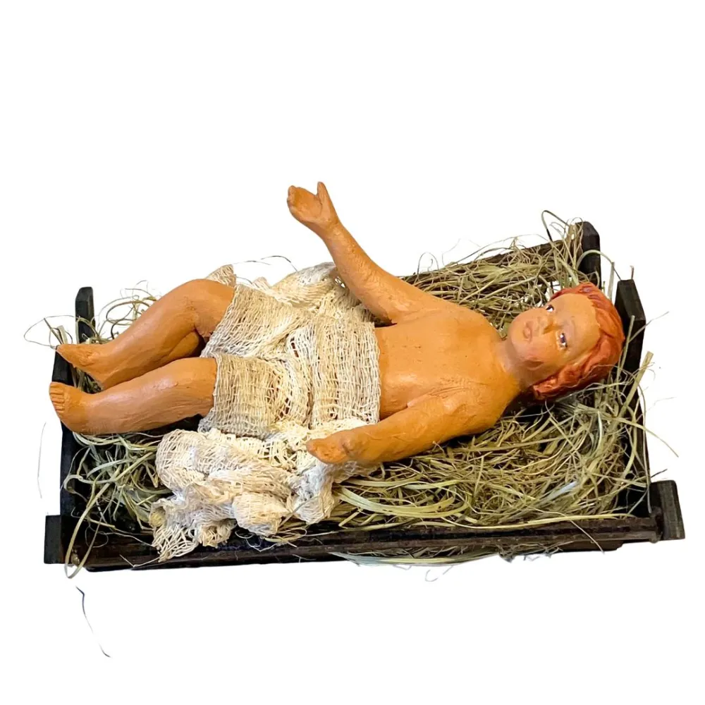 Bambino Gesù in terracotta per statue da 25 cm adagiato in una mangiatoia in legno scuro, su un letto di paglia. Il corpo è scolpito con le braccia aperte e lo sguardo rivolto in alto, in atteggiamento di accoglienza. Il Bambino è avvolto da fasce bianche in tessuto a trama larga, che ne sottolineano la semplicità e il calore della scena della Natività.