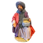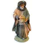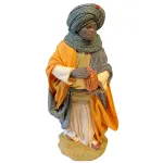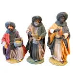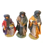 Set tre Re Magi da 25 cm, in terracotta, realizzati con abiti in tessuto finemente drappeggiati. Ciascuna figura è scolpita con posa distinta ( uno inginocchiato e gli altri due in piedi) e porta un dono: oro, incenso e mirra.