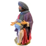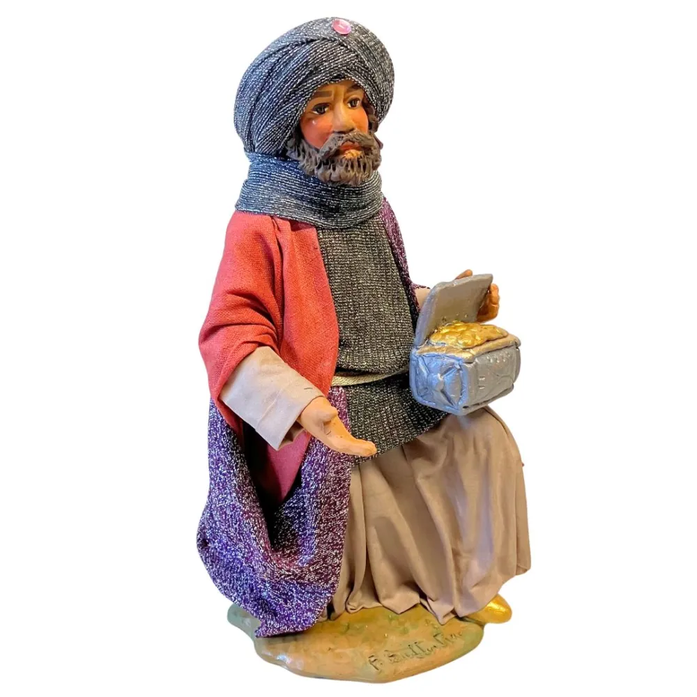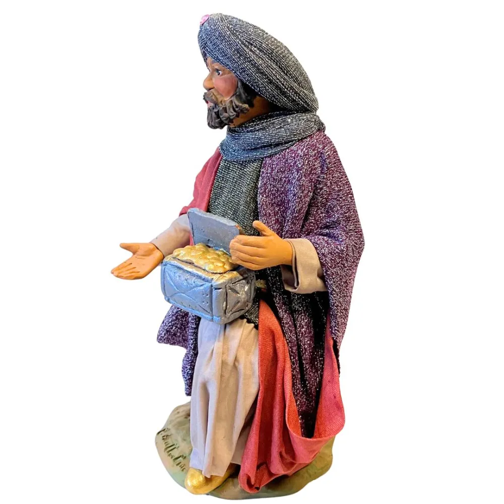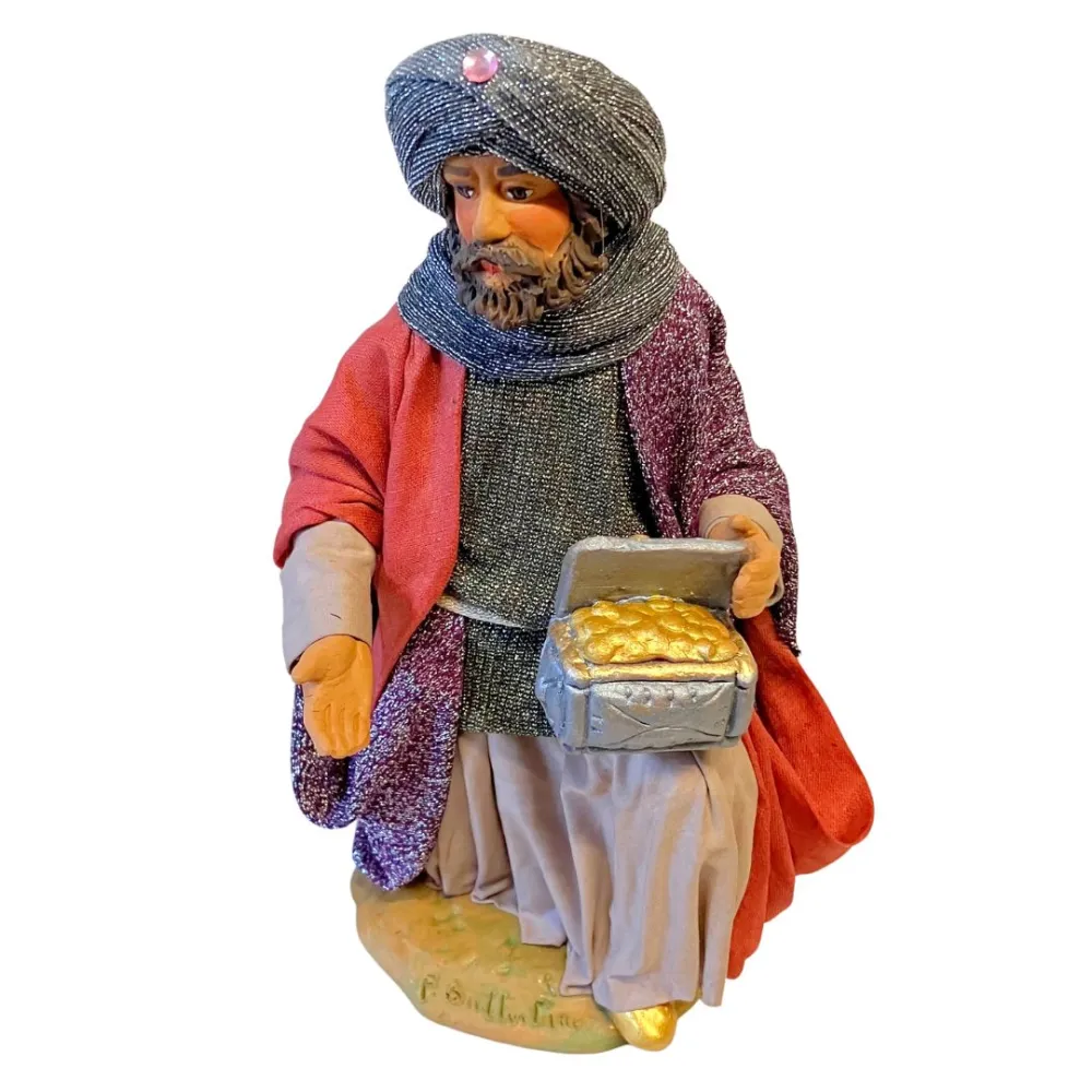 Re Magio, per statue da 25 cm in terracotta, inginocchiato in atto di offrire un cofanetto colmo d’oro. La figura presenta un abbigliamento ricco in vero tessuto. Il volto è scolpito con espressione serena e lo sguardo rivolto in avanti. Il cofanetto, accuratamente dipinto, è tenuto con una mano sul ginocchio e simboleggia l’oro offerto a Gesù Bambino.