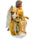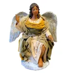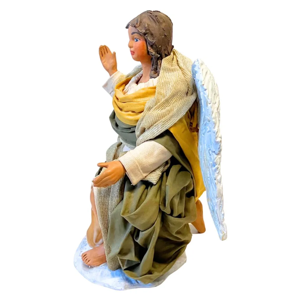 Angelo inginocchiato in terracotta per statue da 25 cm, con ali spiegate dipinte in toni perlacei. L'angelo indossa abiti in vero tessuto, disposti con eleganza attorno al corpo. La figura presenta una mano alzata in gesto benedicente e l’altra abbassata, con espressione serena e rassicurante. Ideale come elemento centrale della Natività o per completare scene celesti nel presepe.
