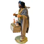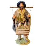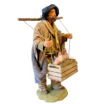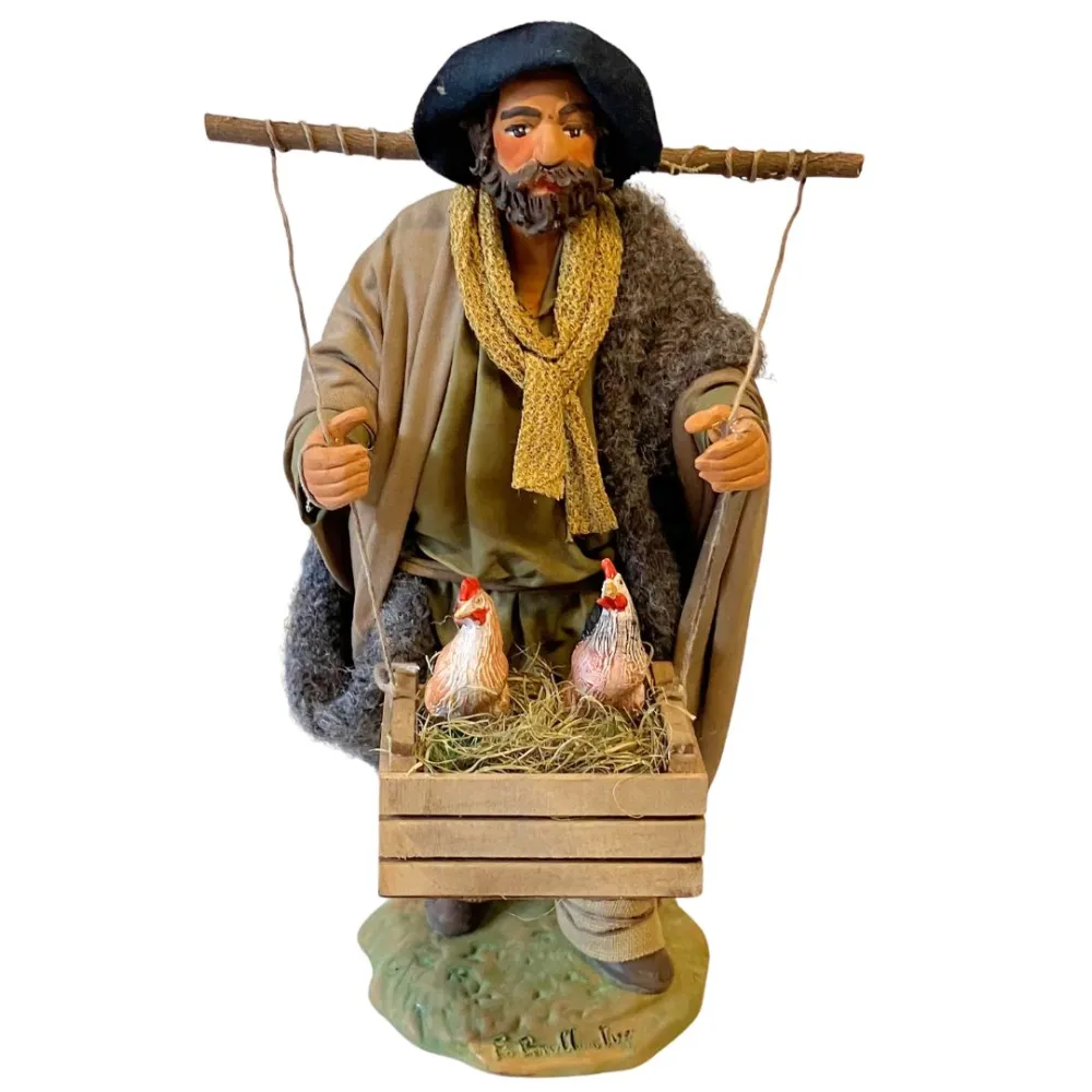 Statua in terracotta da 25 cm con abiti in tessuto, raffigurante un contadino in piedi con una cesta appesa a un bastone sulle spalle, contenente due galline adagiate su un letto di paglia. Ideale per arricchire scene rurali o mercati contadini nel presepe.