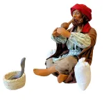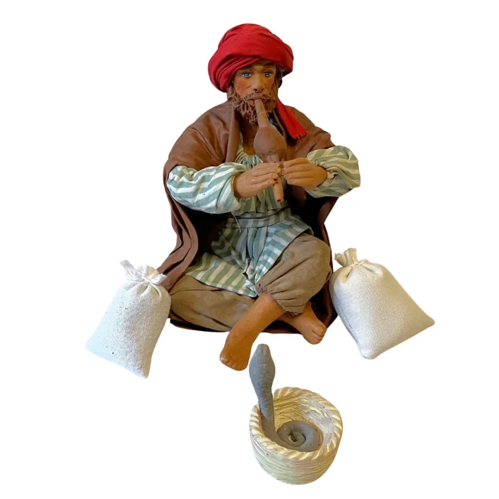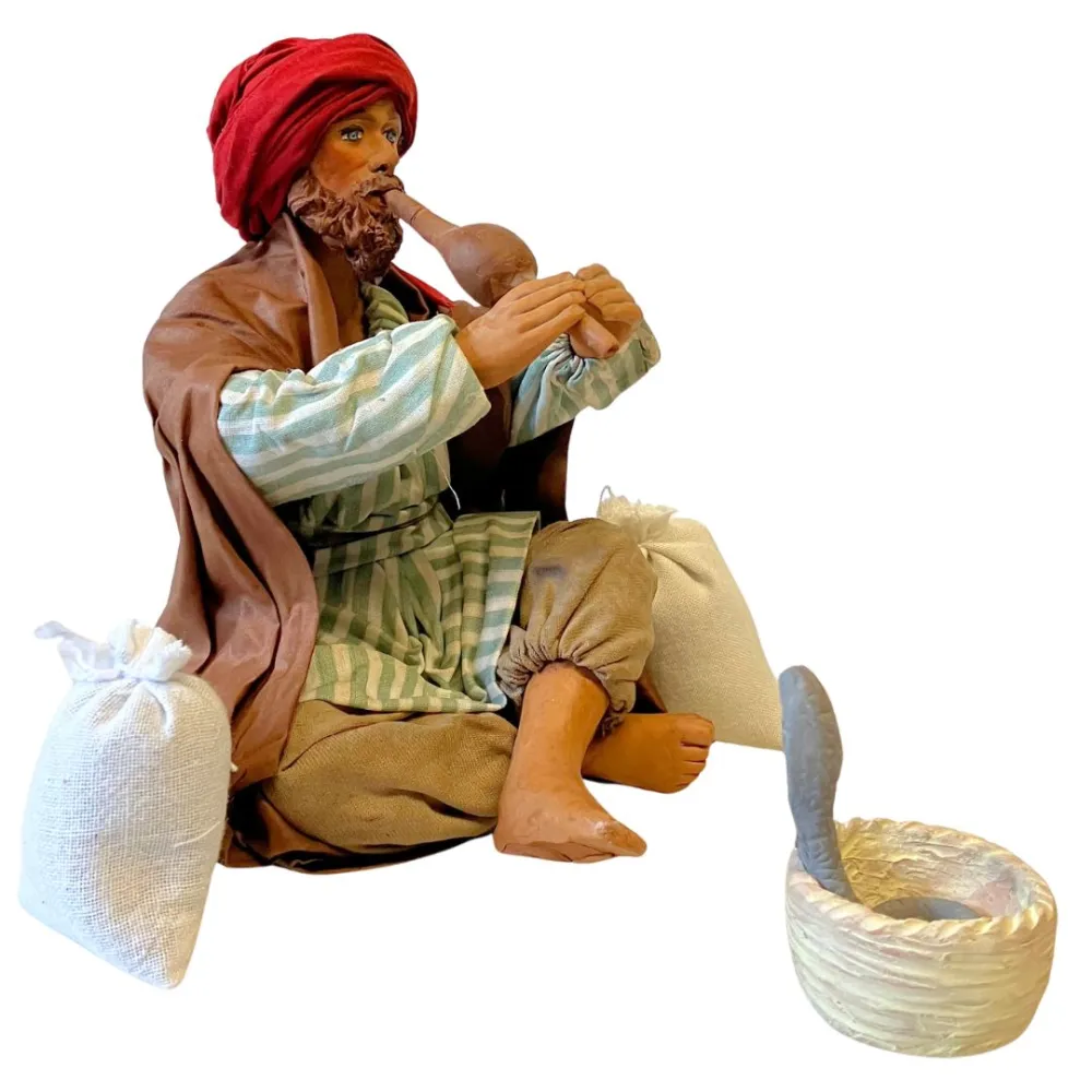 Incantatore di serpenti in terracotta per statue da 25 cm, con abiti in tessuto. Il personaggio è raffigurato seduto mentre suona uno strumento a fiato per incantare un serpente che emerge dal cesto di vimini. Accanto a lui due sacchi bianchi in tessuto. Una figura originale per ambientazioni orientali e scene esotiche nel presepe.