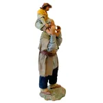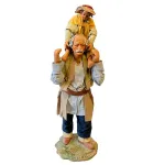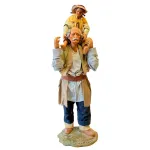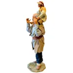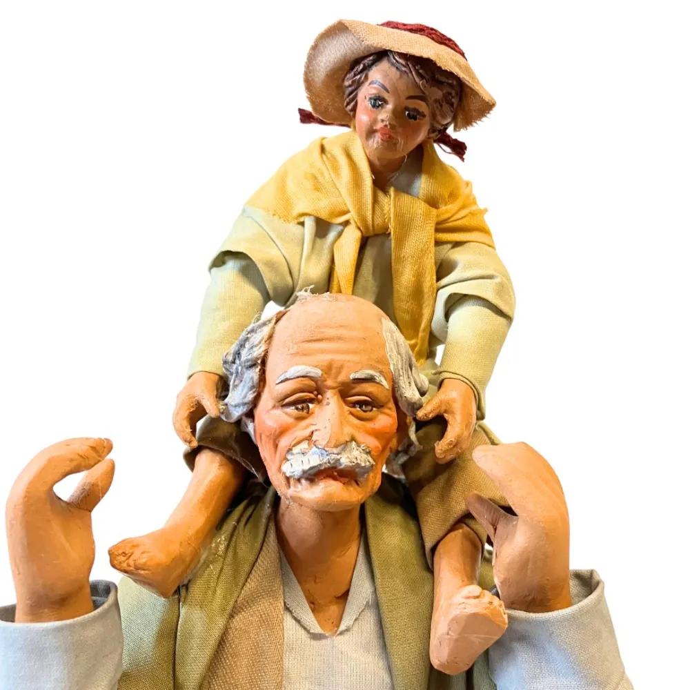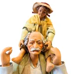 Statua da 25 cm in terracotta con vestiti in tessuto raffigurante un uomo anziano che porta un bambino sulle spalle, in una posa realistica e affettuosa. Una scena familiare che dona calore e umanità all’ambientazione del presepe.