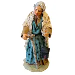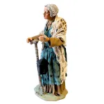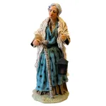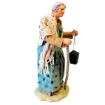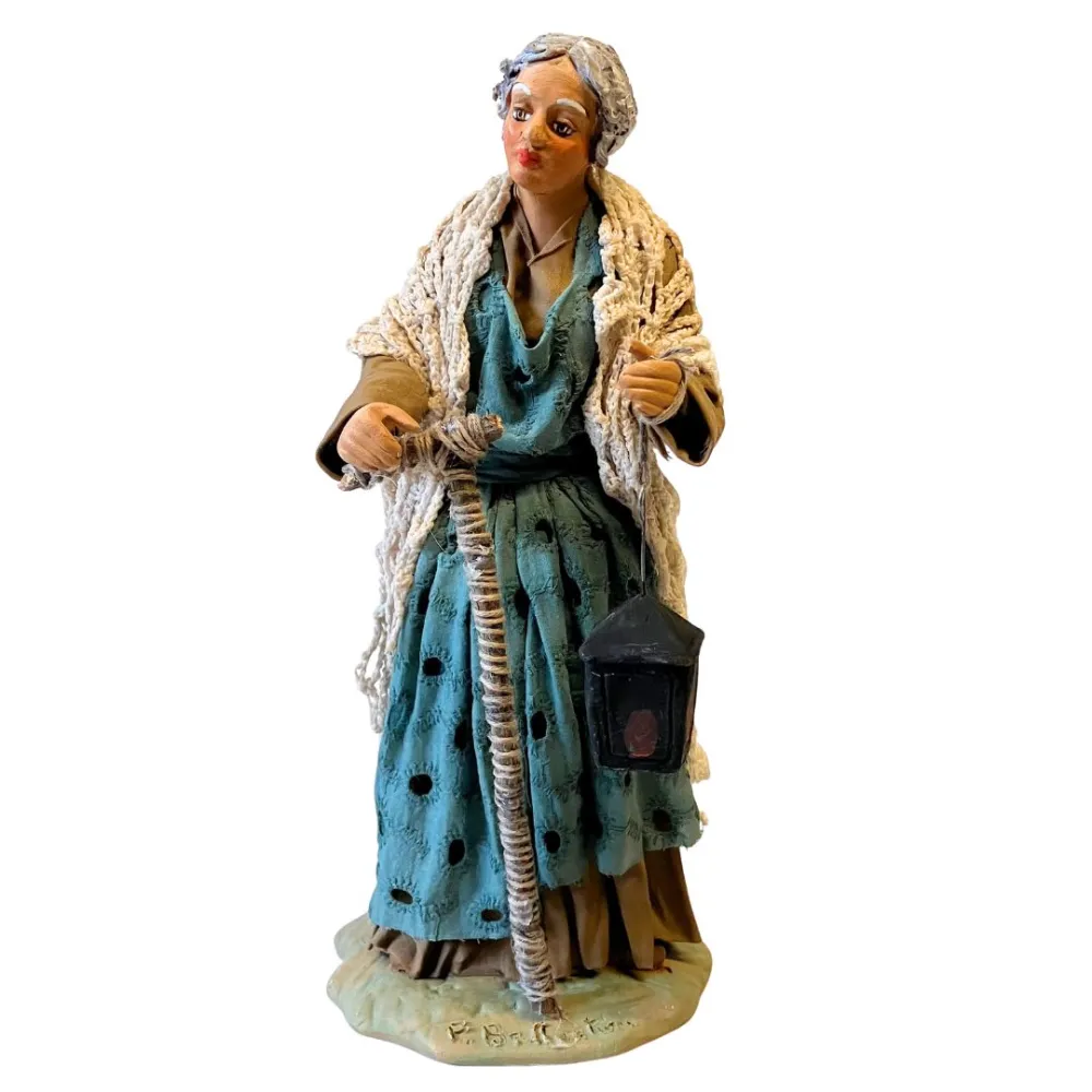 Statua da 25 cm realizzata in terracotta, rifinita con abiti in tessuto, raffigurante una donna anziana in posizione eretta, mentre regge un bastone intrecciato e una lanterna nera. I dettagli del volto e la postura trasmettono attenzione e delicatezza, ideali per arricchire scene notturne o ambientazioni di veglia.