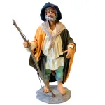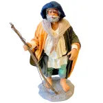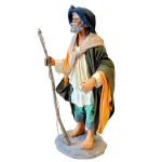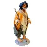 Statua in terracotta da 25 cm raffigurante un pescatore a piedi scalzi, con canna da pesca in legno. L’uomo è vestito con abiti in tessuto. La postura dritta e il volto barbuto lo rendono adatto a contesti rurali o ambientazioni costiere nel presepe.