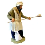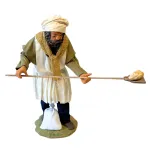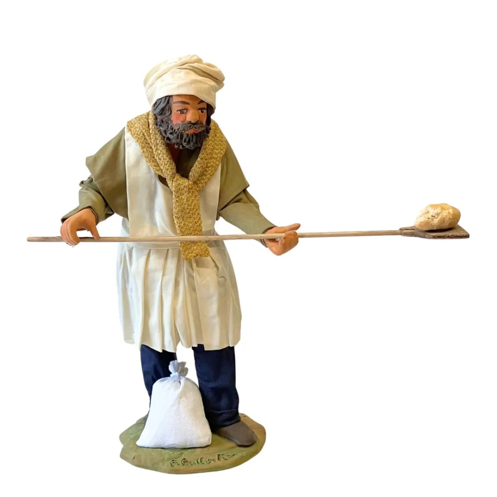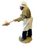 Statua da 25 cm in terracotta dipinta a mano e con abiti in vero tessuto, raffigurante un fornaio nell’atto di infornare il pane. La figura è dotata di pala in legno con pagnotta e sacco di farina ai piedi. Ideale per ambientazioni con forni o botteghe nel presepe.