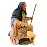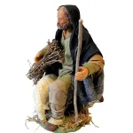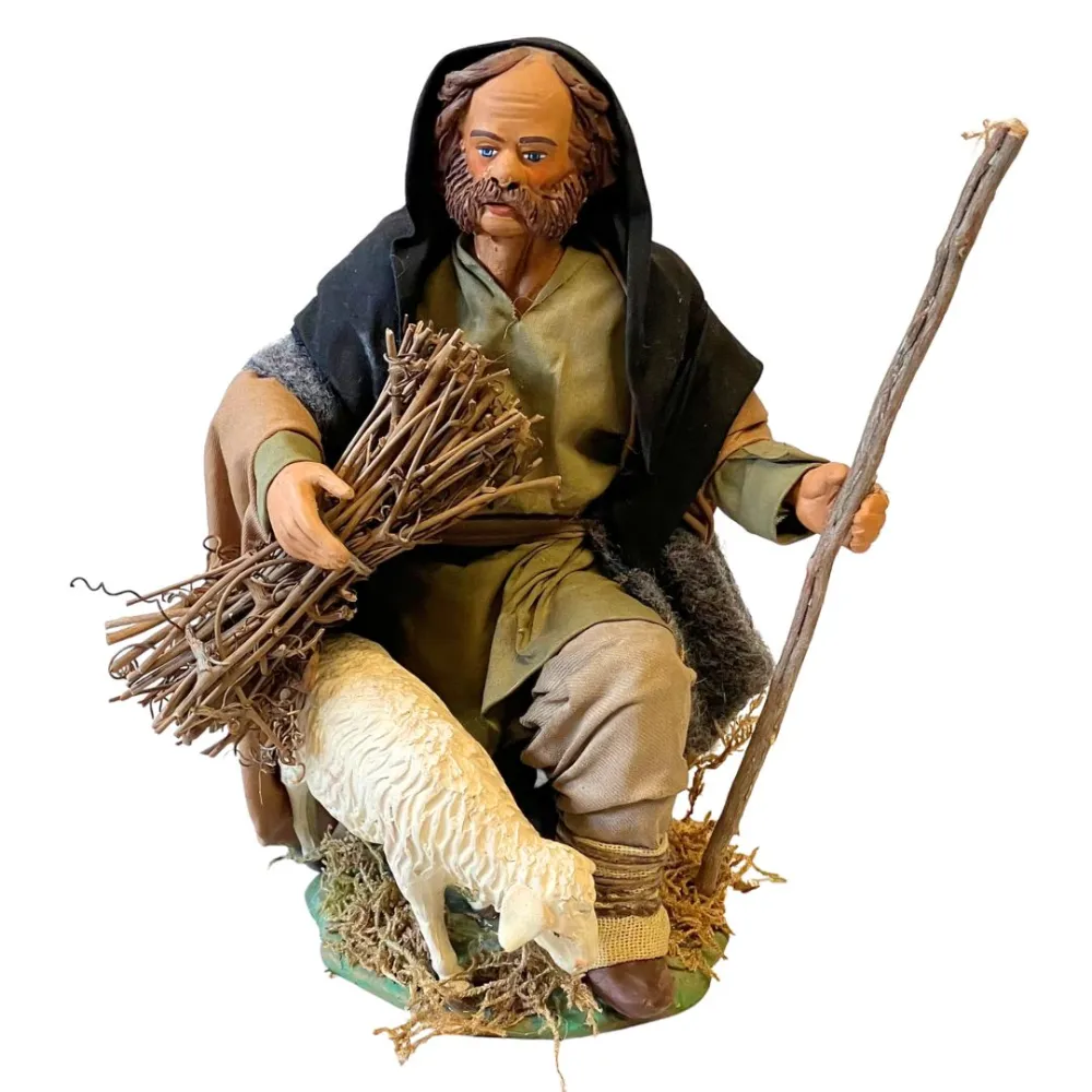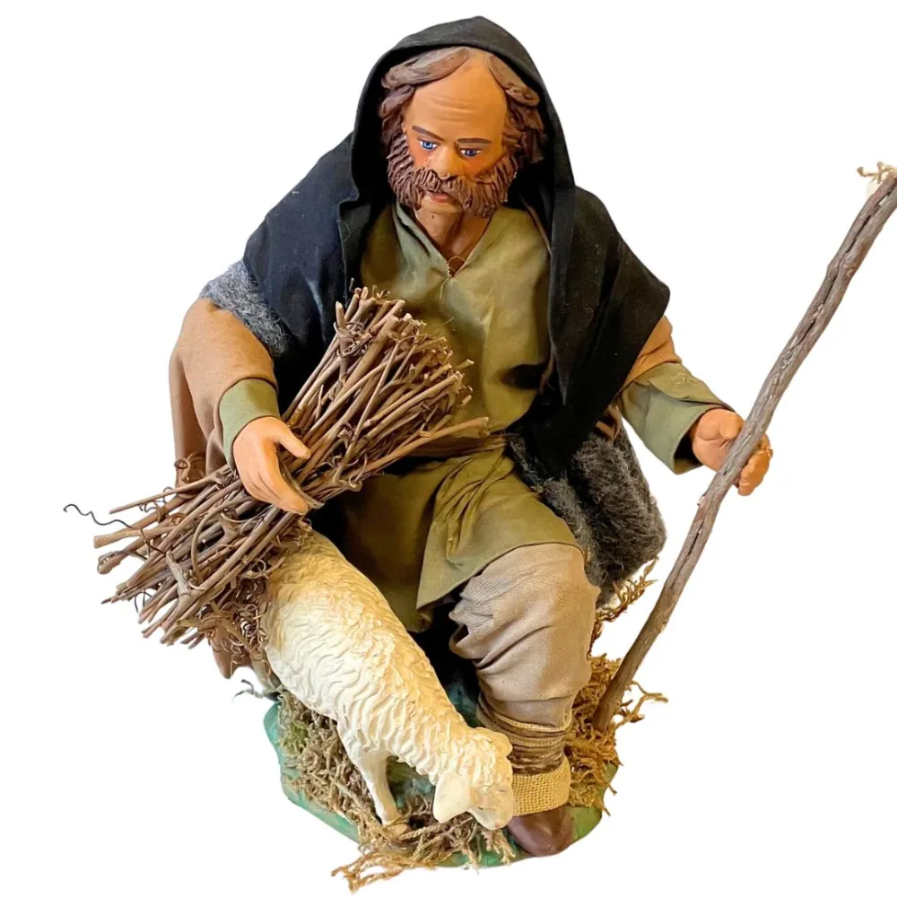 Figura artigianale per statue da 25 cm, in terracotta, raffigurante un pastore inginocchiato, con fascina di legna in braccio, bastone nella mano sinistra e una pecora accanto. Gli abiti sono realizzati in vero tessuto. Ideale per ambientazioni montane o di stalla.